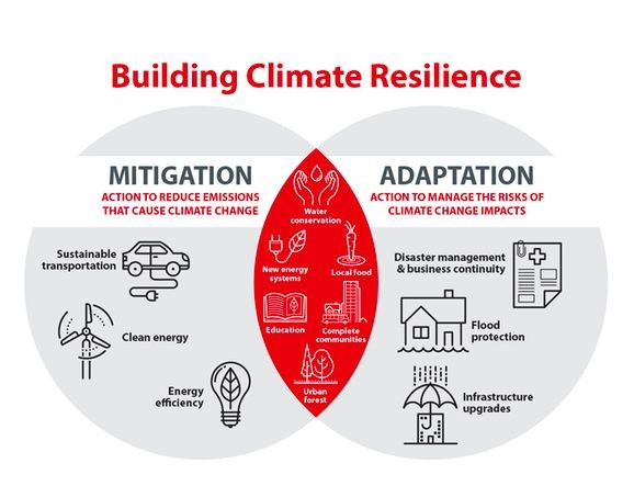 This image illustrates the dual strategies of climate resilience—mitigation and adaptation. While mitigation focuses on reducing emissions through clean energy and efficiency, adaptation emphasizes preparedness through infrastructure upgrades and disaster management.