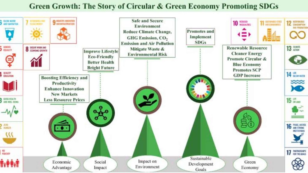 The image showcases the circular and green economy’s role in achieving Sustainable Development Goals (SDGs) by linking environmental impact, economic growth, and social benefits through green practices.