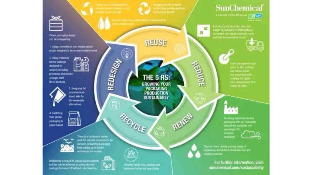 The image from SunChemical illustrates the 5 R’s of sustainable packaging—Redesign, Reuse, Reduce, Renew, and Recycle—highlighting practical steps for eco-conscious packaging solutions.