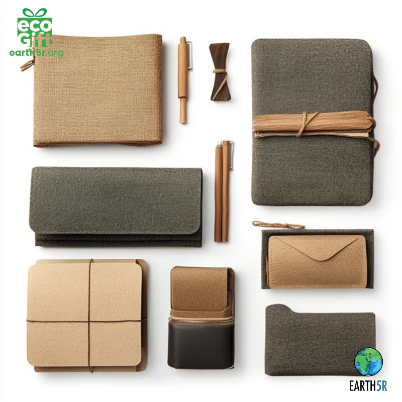 Includes recycled paper notebooks, bamboo pens, and tote bags.