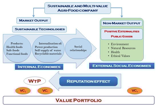 This infographic illustrates how sustainable agri-food companies create shared value through market outputs, sustainable technologies, and positive social externalities. It highlights that integrating environmental, health, and ethical public goods builds reputation and strengthens long-term value portfolios.