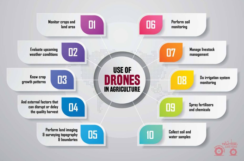 This infographic highlights the multiple uses of drones in agriculture, from crop monitoring and soil analysis to irrigation and livestock management.