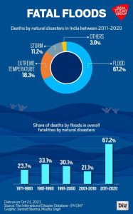 The infographic shows that floods accounted for 67.2% of deaths caused by natural disasters in India between 2011-2020, a sharp rise compared to previous decades. This highlights the growing severity of flood-related fatalities and the urgent need for improved flood resilience measures.