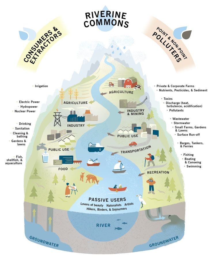 This illustration of Riverine Commons highlights the diverse stakeholders dependent on rivers—from consumers and extractors like agriculture and industry to polluters and passive users—showing the complex interplay of usage, pollution, and preservation. It underscores the urgent need for integrated river management to ensure sustainability for all.