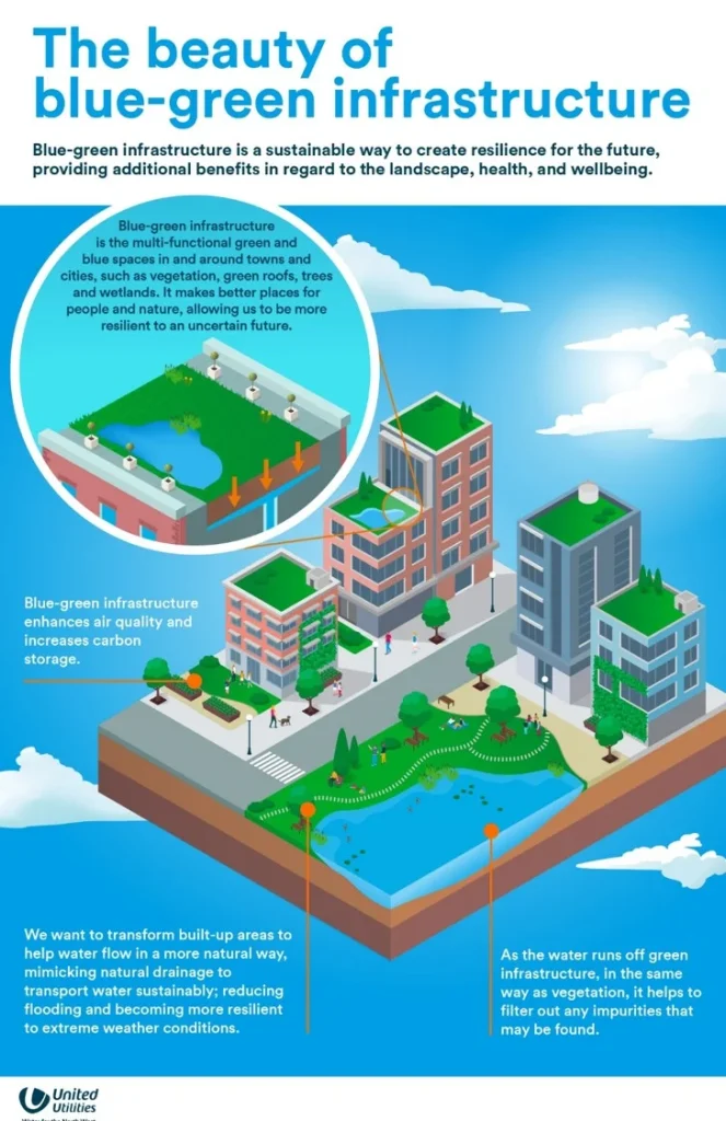 This infographic explains how blue-green infrastructure combines natural systems like green roofs, wetlands, and urban vegetation with city design to build resilience against climate change.