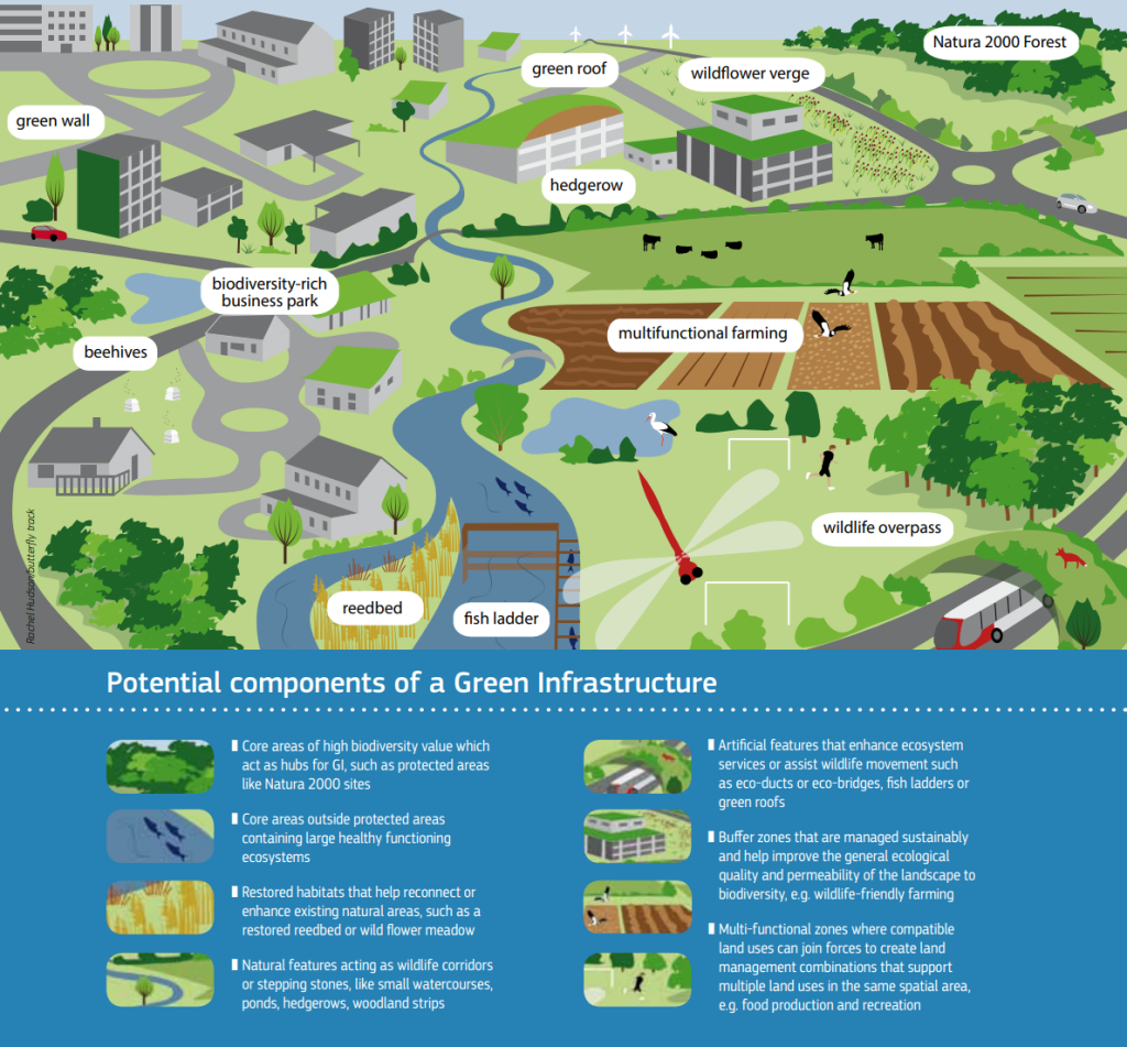 This infographic illustrates the key components of green infrastructure, showing how farms, forests, rivers, and urban spaces can be interconnected to support biodiversity and resilience.