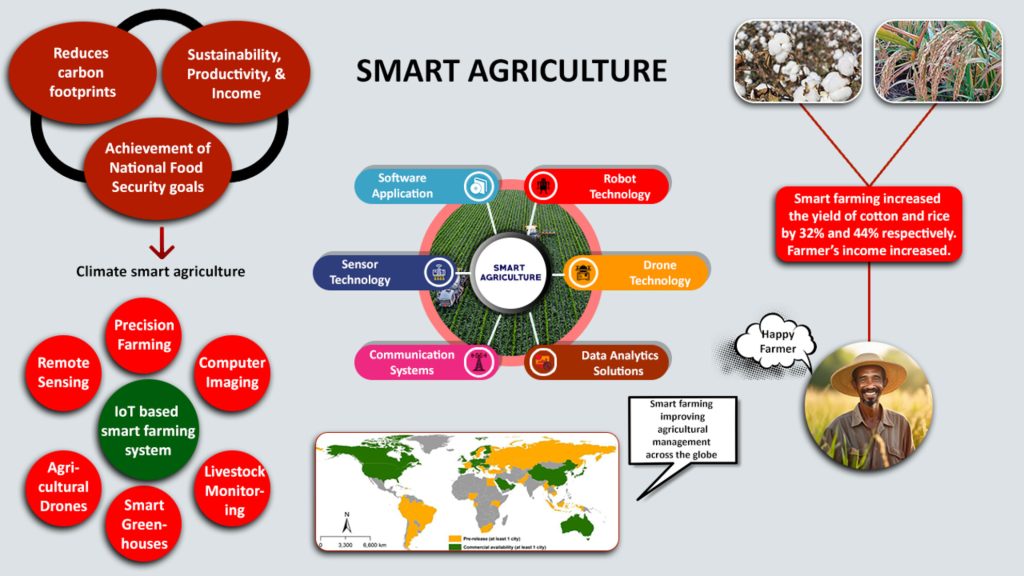 This infographic highlights how smart agriculture integrates technologies like drones, sensors, and data analytics to boost crop yield and farmer income. It reflects a shift in rural awareness—from traditional practices to informed, sustainable, and climate-smart farming decisions.