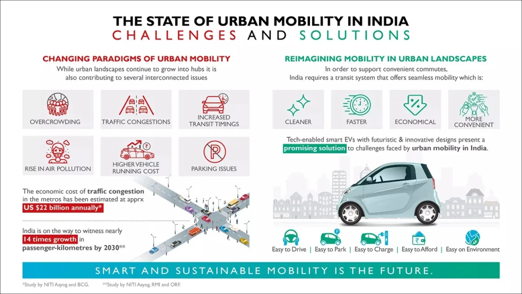 This infographic highlights the challenges of urban mobility in India such as congestion, pollution, and high vehicle costs.