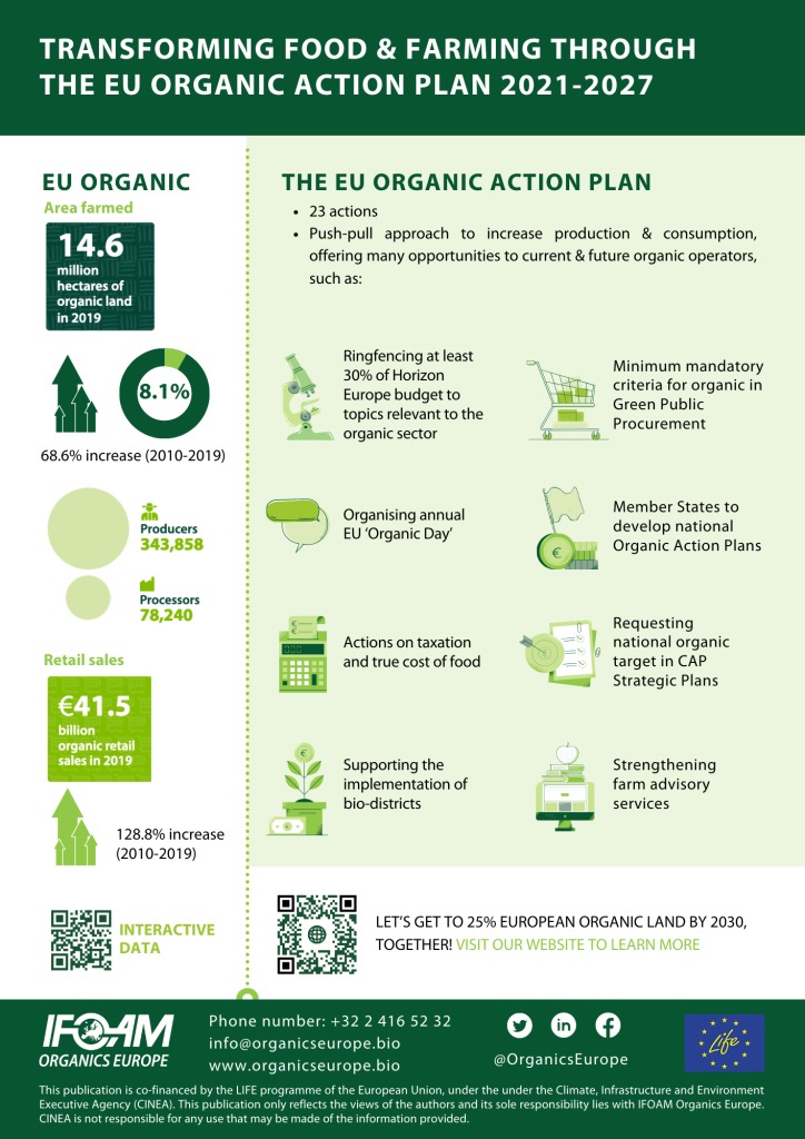 This infographic highlights the EU Organic Action Plan 2021-2027, showcasing targeted policies to boost organic production and consumption across Europe. It demonstrates how structured government actions can transform food systems and accelerate the organic movement from policy to plate.