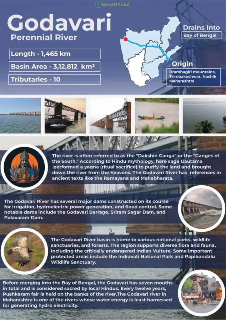 This infographic provides an overview of the Godavari River, India’s second-longest river, often referred to as the “Dakshin Ganga” or “Ganges of the South.” It highlights key features like the river’s origin in Trimbakeshwar (Maharashtra), its length (1,465 km), basin area (3,12,812 km²), and significant dams such as Sriram Sagar and Polavaram. It also illustrates the river’s ecological and religious significance, including Pushkaram fair, biodiversity in Papikondalu Sanctuary, and its cultural ties with the Ramayana and Mahabharata.