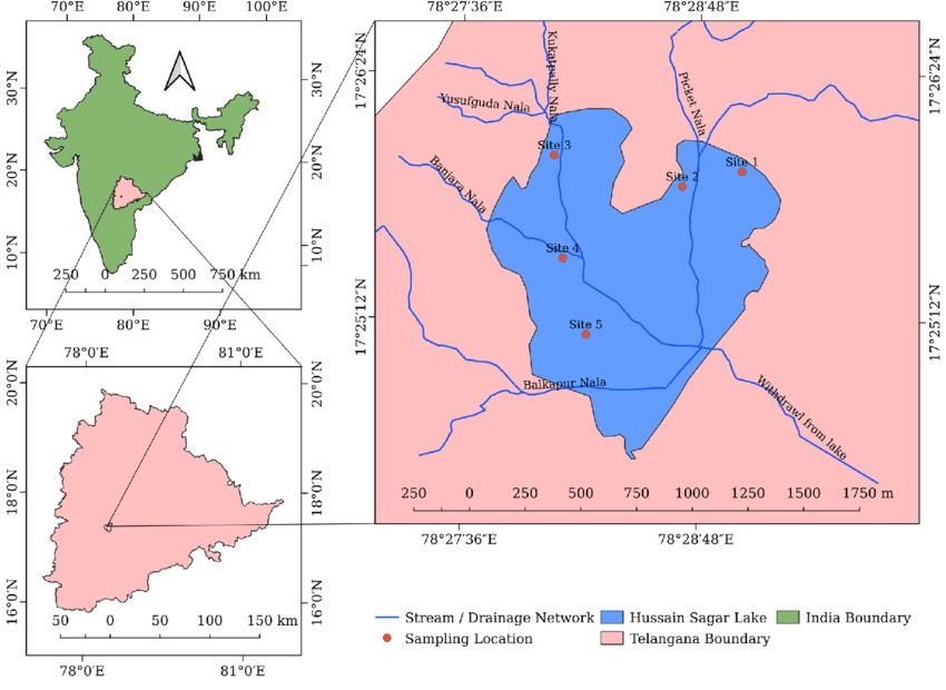 This infographic illustrates the drainage network and sampling locations within the Hussain Sagar Lake catchment area in Hyderabad. It highlights key inflows like the Balkapur and Picket Nalas, emphasizing the lake’s hydrological dynamics crucial for its sustainable restoration.