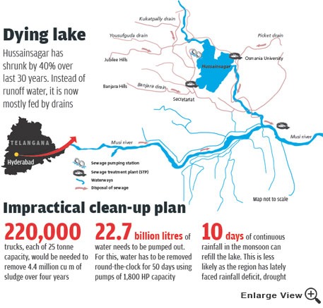 This infographic highlights the alarming shrinkage of Hussain Sagar Lake, which has reduced by 40% over the past 30 years due to sewage-fed drains. It also underscores the impracticality of the proposed clean-up plan, emphasizing the urgent need for sustainable restoration efforts.