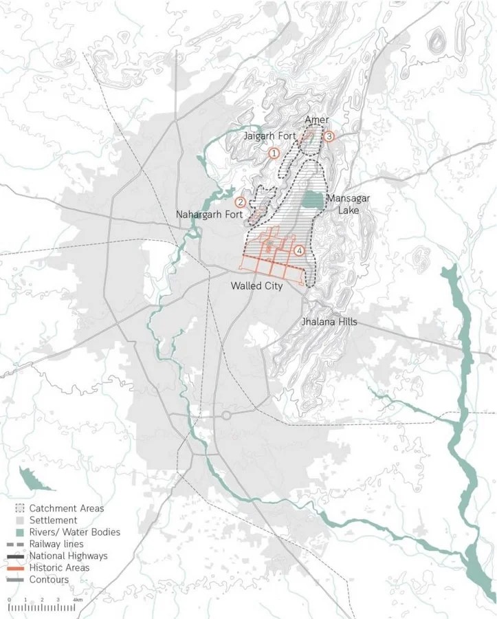 This map highlights the spatial context of Mansagar Lake within Jaipur, showing its proximity to key landmarks like Nahargarh Fort and the Walled City. It outlines the lake’s catchment area in relation to settlements, Jhalana Hills, and major transport routes, emphasizing its urban integration and ecological significance.