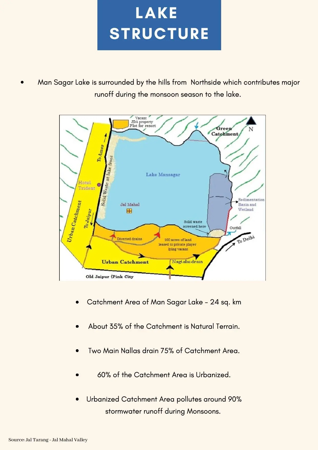 This infographic illustrates the catchment structure of Mansagar Lake, showing how runoff from the surrounding hills—especially the north side—feeds into the lake during monsoon. It highlights the urban and natural terrains influencing water flow, with key zones like the green and urban catchments and two major nallas draining 75% of the area.