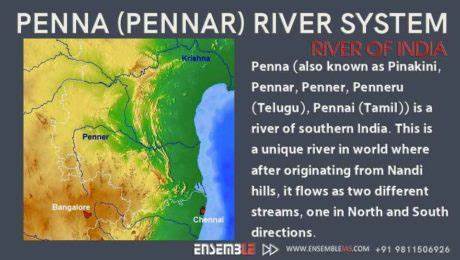 The Pennar River, one of the prominent east-flowing rivers of peninsular India, originates in the Nandi Hills of Karnataka. It travels over 597 kilometers through the states of Karnataka and Andhra Pradesh before draining into the Bay of Bengal near the coastal city of Nellore.