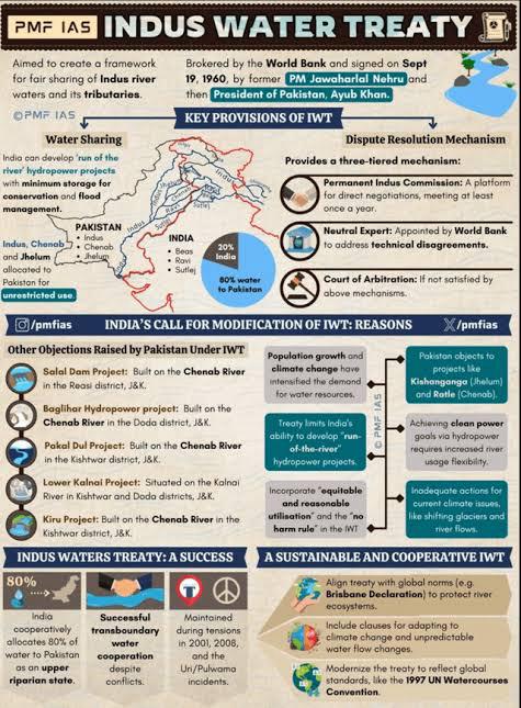 This infographic outlines the key provisions and structure of the Indus Water Treaty between India and Pakistan. It includes water-sharing details, dispute resolution mechanisms, and reasons for calls to modify the treaty.