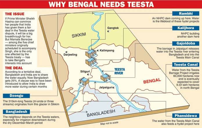 This infographic highlights the geopolitical and developmental importance of the Teesta River for both India and Bangladesh, detailing key hydropower projects, irrigation canals, and the ongoing water-sharing dispute. It shows how vital the Teesta is to North Bengal’s agriculture and hydroelectric infrastructure, as well as downstream regions in Bangladesh.