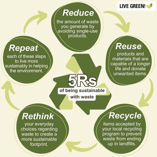 This image illustrates the “5Rs” of sustainability – Reduce, Reuse, Recycle, Rethink, and Repeat – as a circular process for managing waste and living green. It emphasizes how each step contributes to a more sustainable lifestyle and helps protect the environment.