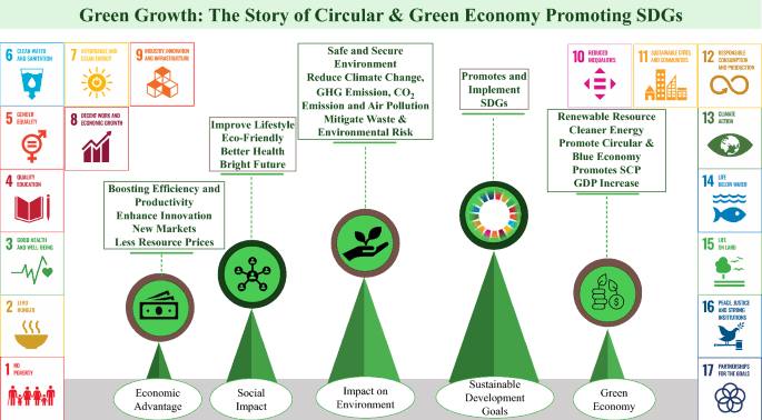 This image depicts the interconnectedness of green growth, circular economy, and sustainable development goals, highlighting their positive impacts on various aspects of society and the environment. It visually represents how economic advantages, social impacts, and environmental considerations contribute to achieving a green economy and implementing the SDGs.