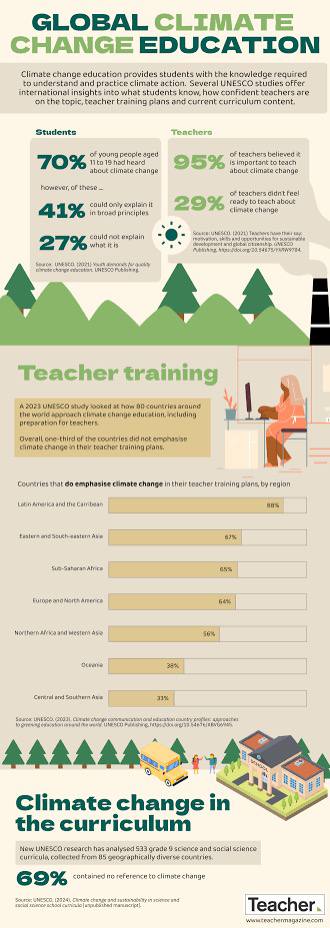 This infographic highlights the global state of climate change education, revealing that while a majority of students have heard of it, a significant portion lacks understanding, and many teachers feel unprepared to teach the subject effectively.