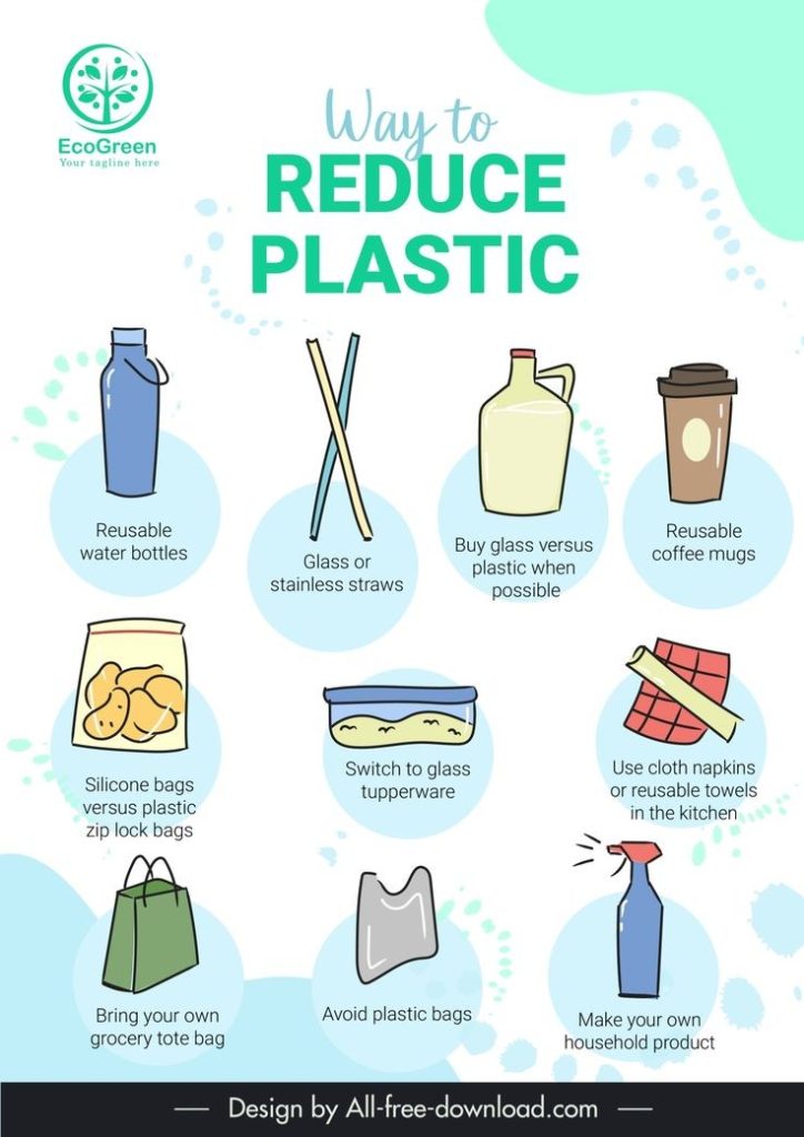 This graphic promotes sustainable habits by encouraging the use of reusable water bottles, glass/stainless straws, and coffee mugs instead of plastic alternatives. It’s a visual reminder that small changes in daily consumption can significantly reduce plastic waste.