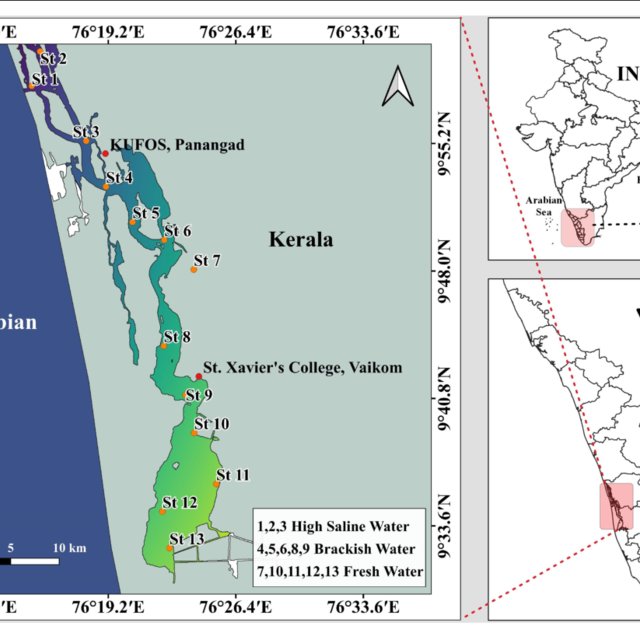 Plastic pollution in Vembanad is especially acute. A comprehensive study by KUFiOS (2023) found plastic concentrations in the lake exceed those of most global estuaries.
