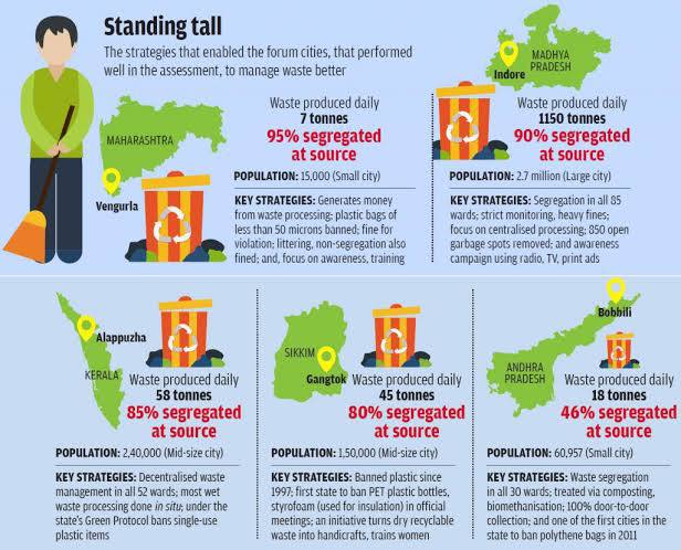 The image highlights waste segregation strategies in different Indian cities, showcasing their effectiveness in managing daily waste.